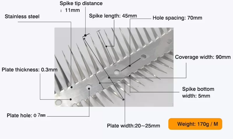 Function: Anti-climbing spikes are a visual and physical deterrent to prevent birds from roosting and rodents from passing through