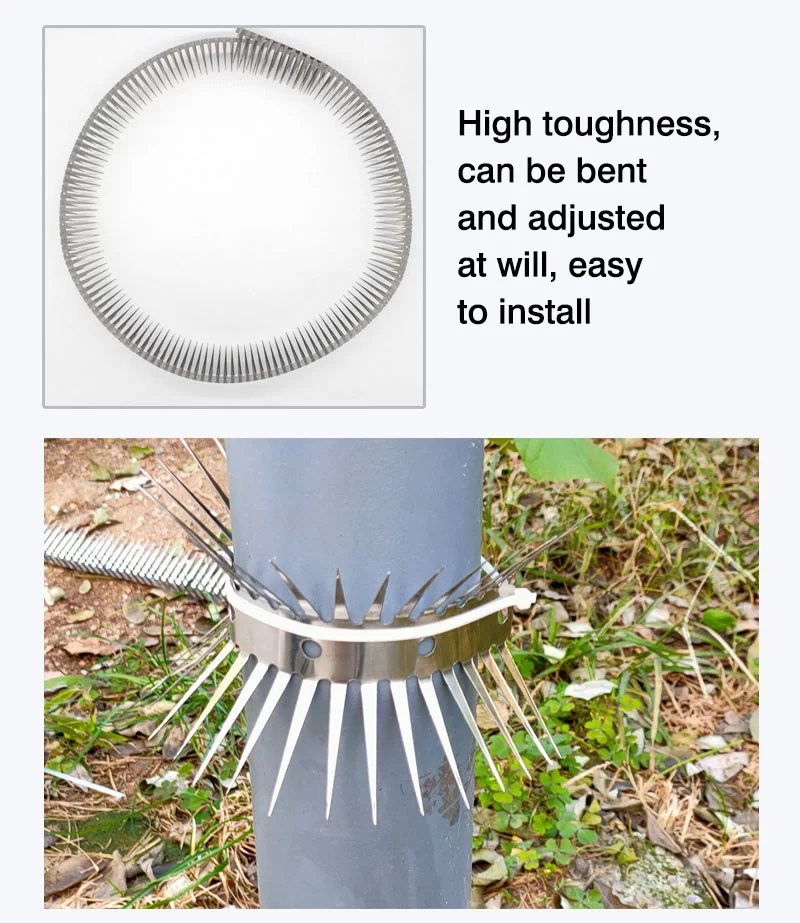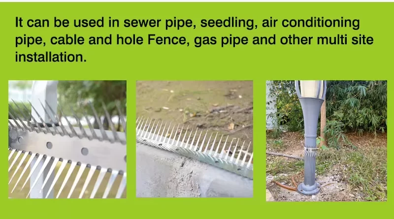 Anti Climb Spikes for more animals, such as ouse.cat, weasel, snake climbing, We used high quality.Stainless steel plate to make. lt's high toughness, can be bent and adjusted an will, easy to install. lt can be used in sewer pipe, seedling, air conditioning pipe, cable and hole fence, gas pipe and other multi site installation.