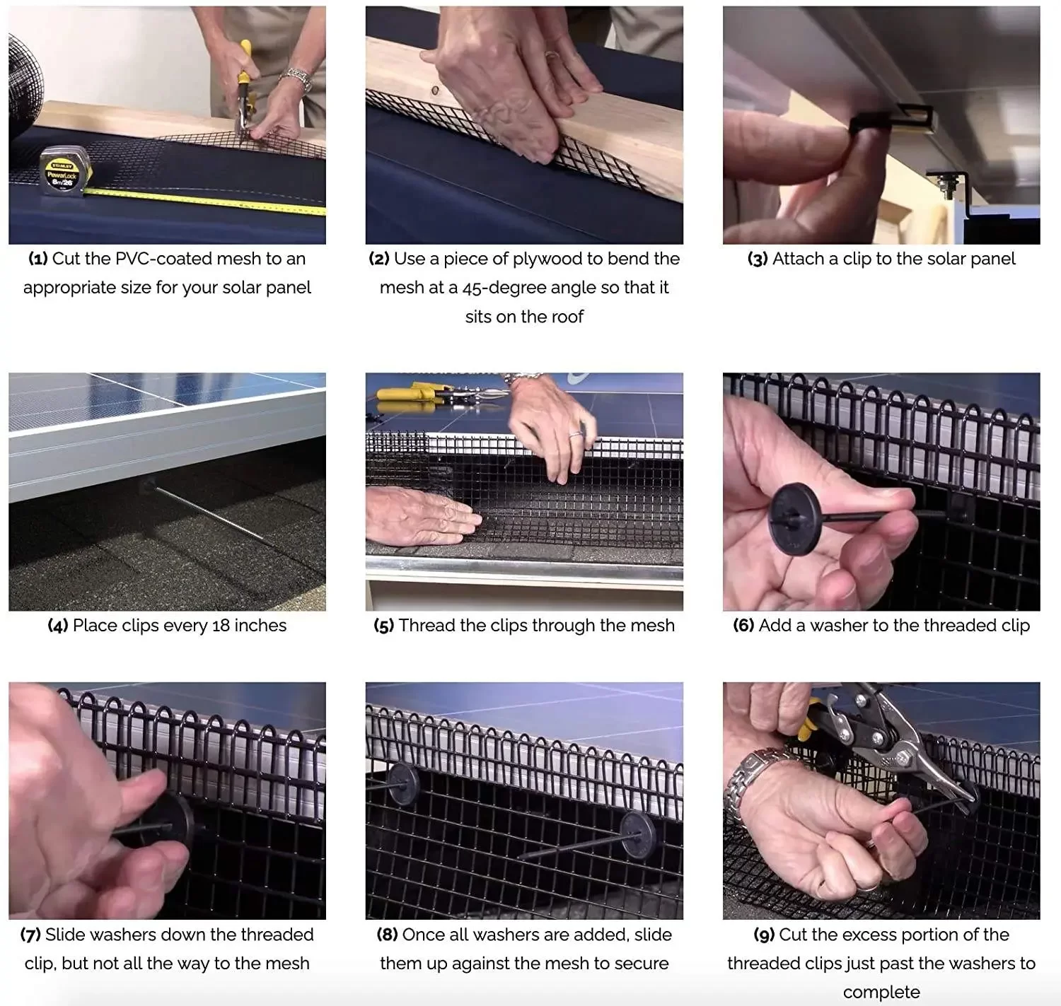 The mesh is made of galvanized steel and coated in black PVC to ensure ultimate weather resistant. The galvanized steel ensures the cut points doesn’t rust and cause discoloration on roofs and the surround solar system components.